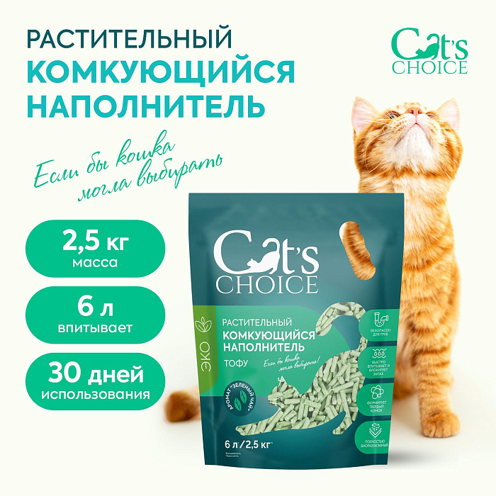 Натуральный растительный наполнитель Cat’s choice из спрессованных соевых волокон с ароматом зеленого чая. Наполнитель быстро абсорбирует влагу и блокирует неприятный запах. Премиальные гранулы диаметром 2 мм обладают способностью образовывать сверхпрочные комки, которые впоследствии легко утилизировать в канализацию. Натуральный состав делает его безопасным для кошек и людей. С Cat’s choice легко поддерживать чистоту и уют в доме.